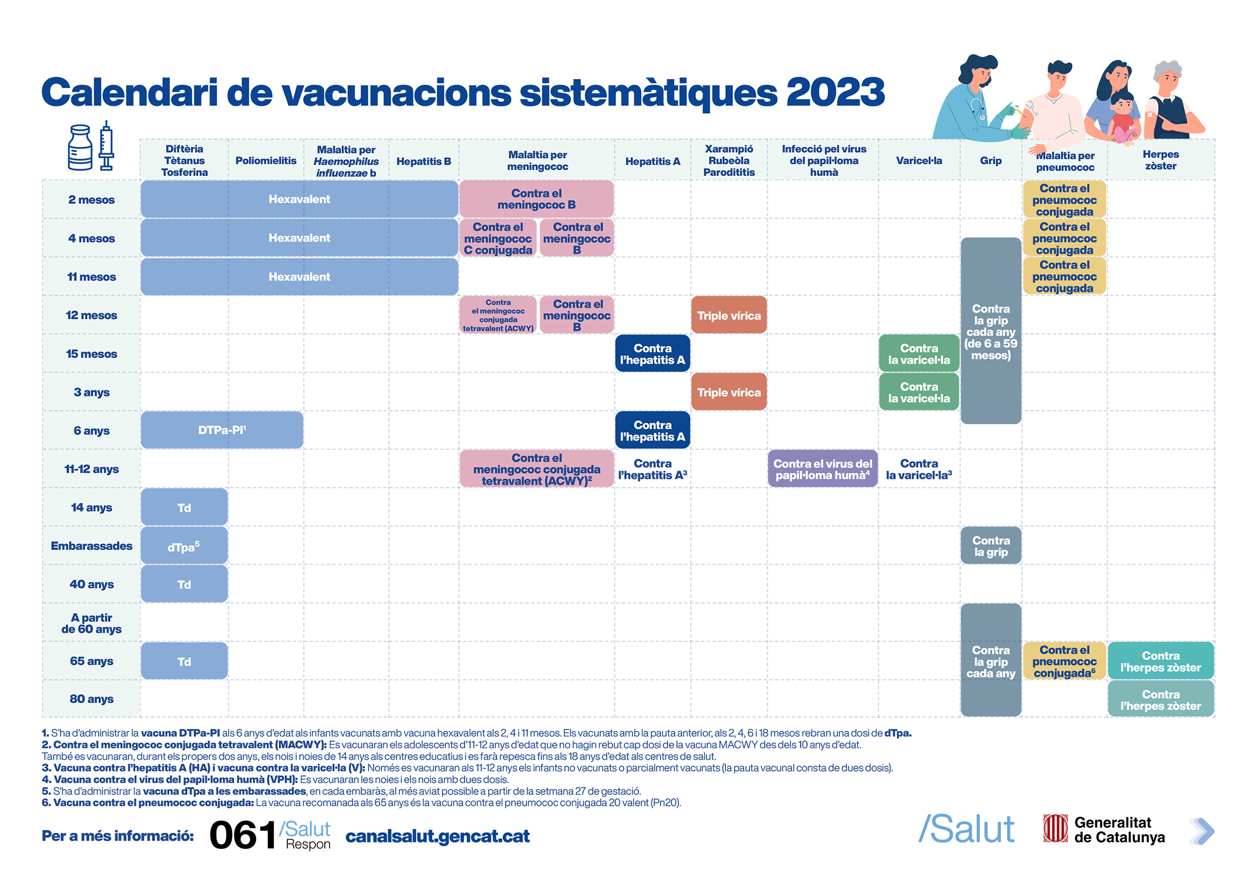 El Calendari de Vacunacions Sistemàtiques de Catalunya de 2023 –que recull les vacunes que es recomanen, a quina edat i de quines malalties protegeixen– inclou 15 vacunes i pro- tegeix contra 16 microorganismes. Entre les novetats, la introducció de la vacunació anual contra la grip en infants d’entre 6 i 59 mesos; i la substitució de la vacuna contra el meningococ C conjugada, administrada als 12 mesos d’edat, per la vacuna contra el meningococ conjugada tetravalent (A, C, W, Y).