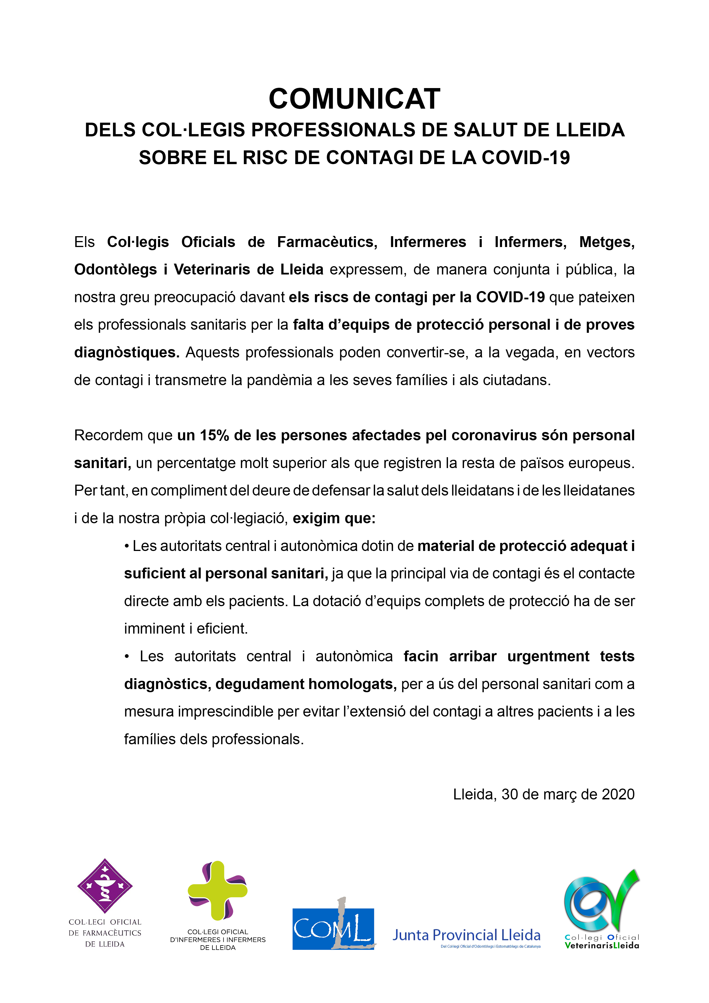 Los Colegios Oficiales de Farmacéuticos, Enfermeras y Enfermeros, Médicos, Odontólogos y Veterinarios de Lleida expresamos, de manera conjunta y pública, nuestra grave preocupación ante los riesgos de contagio por el Covid19 que sufren los profesionales sanitarios por la falta de equipos de protección personal y de pruebas diagnósticas. Estos profesionales pueden convertirse, a su vez, en vectores de contagio y transmitir la pandemia en sus familias y los ciudadanos.