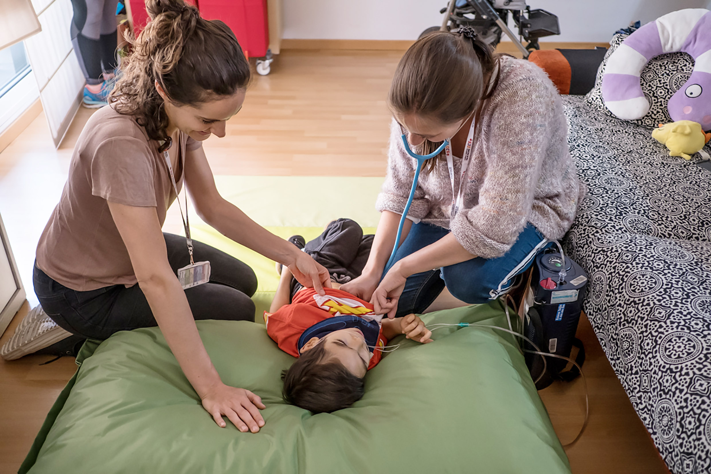 Foto Infermeres de cures pal·liatives examinen un infant en una visita a domicili © Ariadna Creus i Àngel García (Banc Imatges Infermeres)