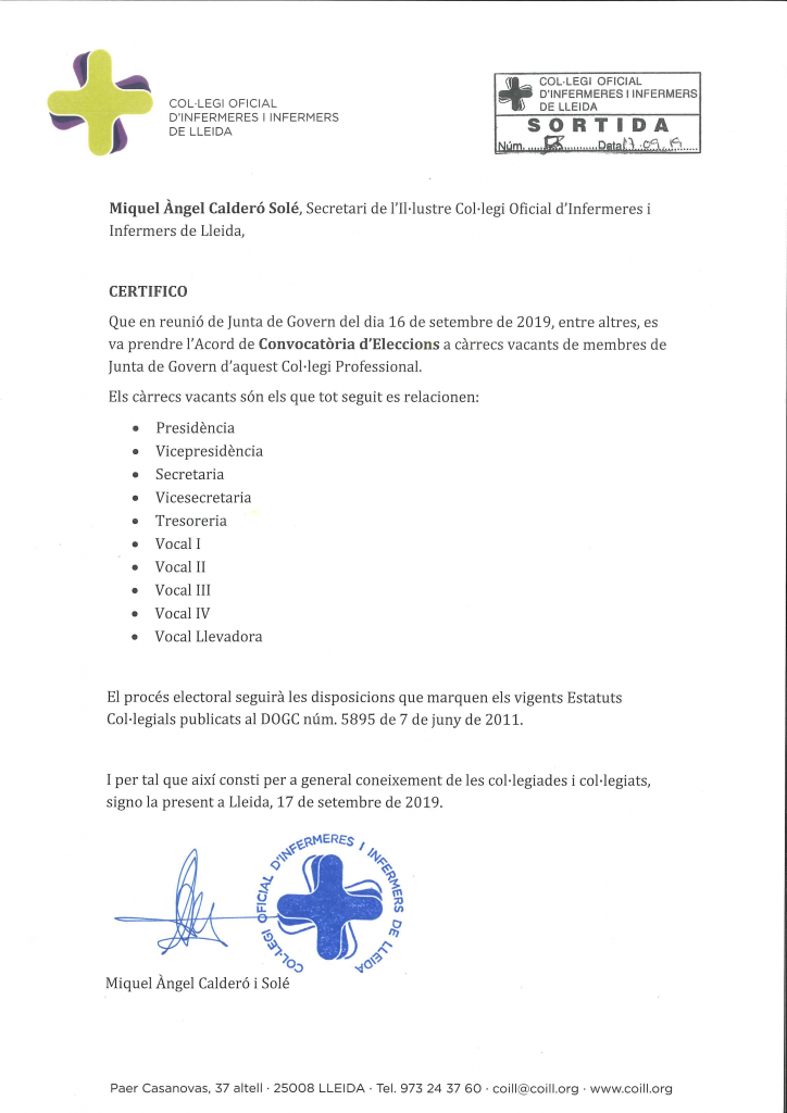 El Col·legi Oficial d’Infermeres i Infermeres de Lleida (COILL) va acordar, ahir dilluns dia 16 de setembre, la Convocatòria d’Eleccions a la Junta de Govern de l’entitat.