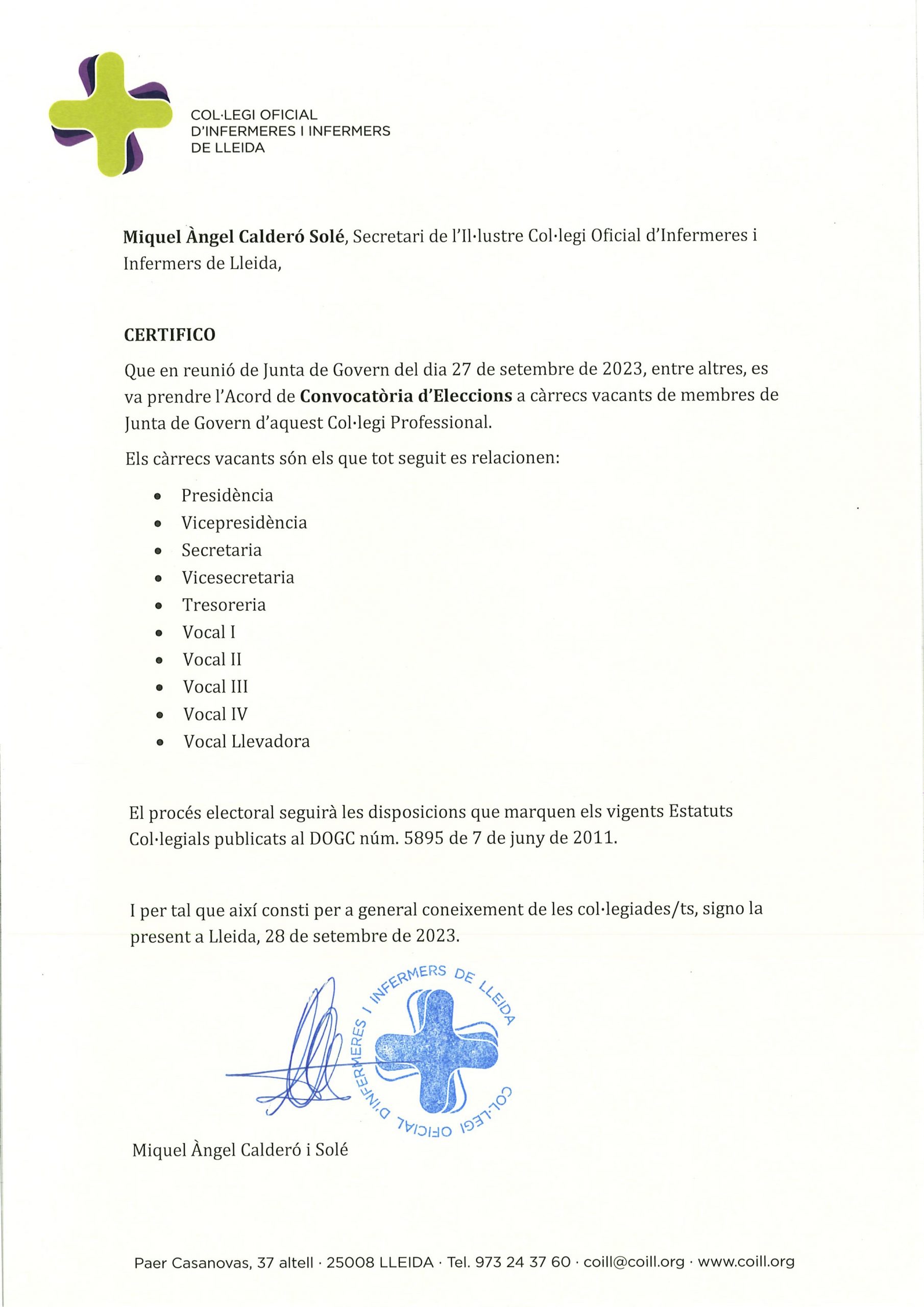 El Col·legi Oficial d’Infermeres i Infermeres de Lleida (COILL) va acordar el passat dimecres, dia 27 de setembre, la Convocatòria d’Eleccions a la Junta de Govern de l’entitat.