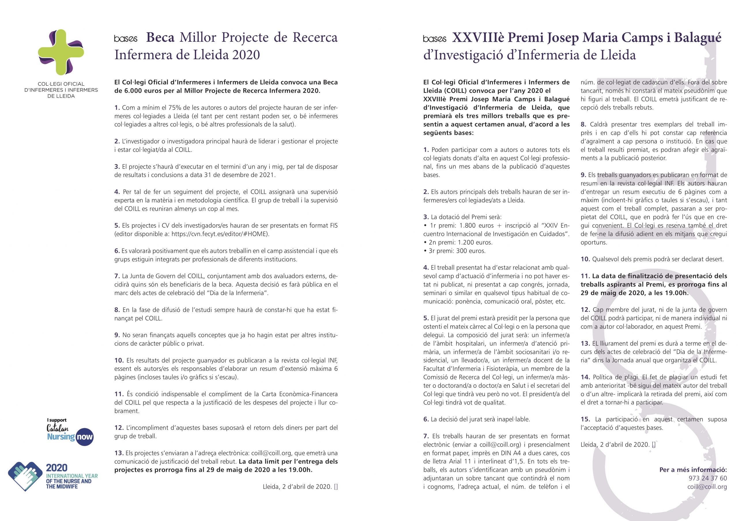El Col·legi Oficial d’Infermeres i Infermers de Lleida (COILL) segueix amb la seva aposta per la recerca en infermeria i destina aquest 2020 –declarat Any Internacional de la Infermera i la Llevadora, per l’Organització Mundial de la Salut (OMS)– gairebé 10.000 euros a aquest propòsit. Per aquest motiu, l’entitat col·legial ha convocat el XXVIIIè Premi Josep M. Camps i Balagué d’investigació d’Infermeria, un guardó que premiarà els tres millors treballs presentats amb 1.800 euros i la inscripció al “XXIV Encuentro Internacional de Investigación en Cuidados” que se celebra a Pamplona aquest novembre; pel primer premi. El segon premi és de 1.200 euros i, el tercer de 300 euros. Per participar en la convocatòria s’ha d’estar col·legiat al COILL i l’autor o autora principal ha de ser, a més, infermer o infermera. Els treballs presentats han d’estar relacionats amb qualsevol camp de la infermeria i no pot haver estat publicat o presentat en cap congrés en cap format. Amb motiu de la crisi sanitària del COVID19, el termini de presentació dels treballs s’amplia al 29 de maig i els premis, que poden declarar-se deserts, es lliuraran en el transcurs de la Diada de la Infermeria que organitza el COILL anualment.