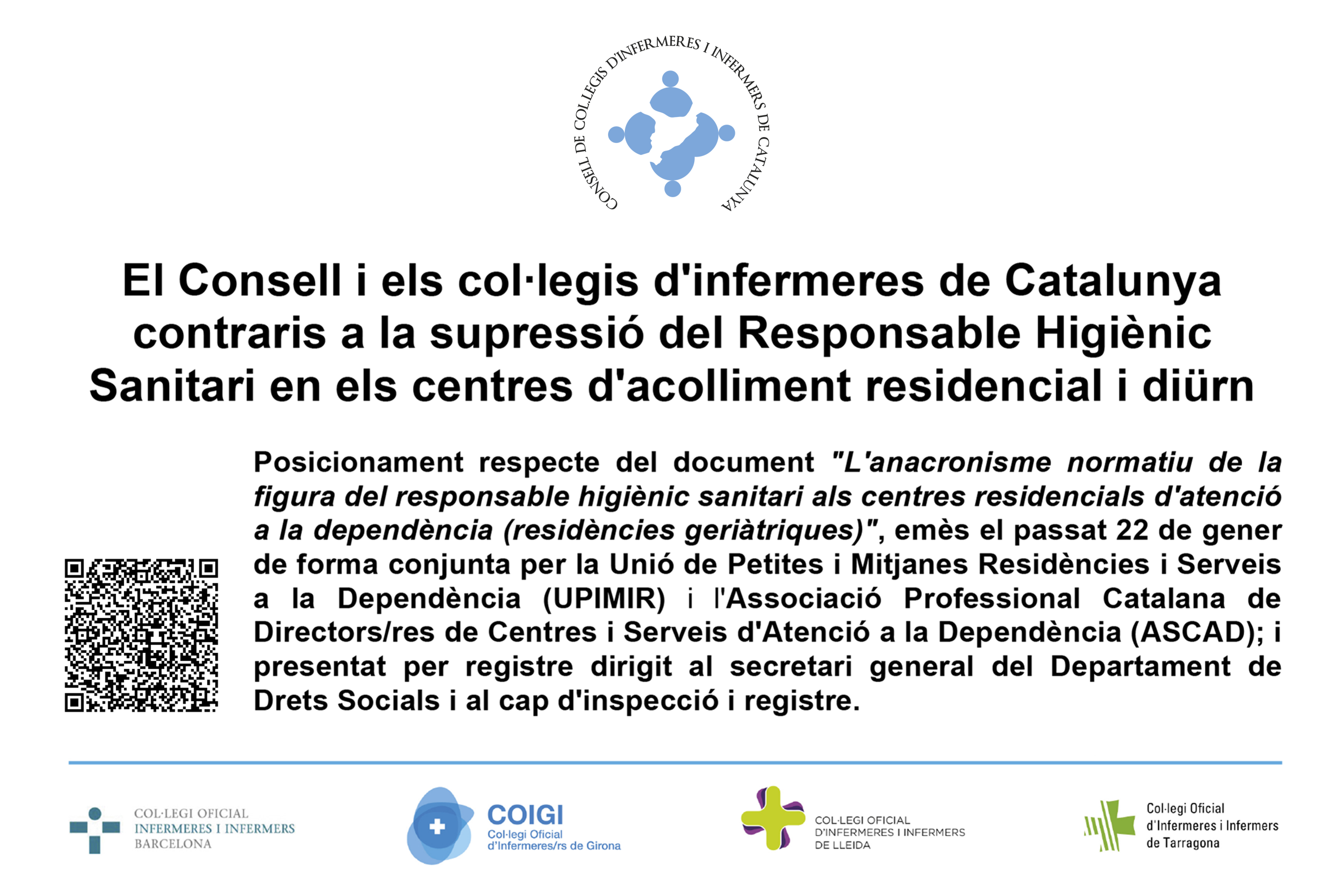 El Consell i els col·legis d’infermeres de Catalunya contraris a la supressió del Responsable Higiènic Sanitari en els centres d’acolliment residencial i diürn