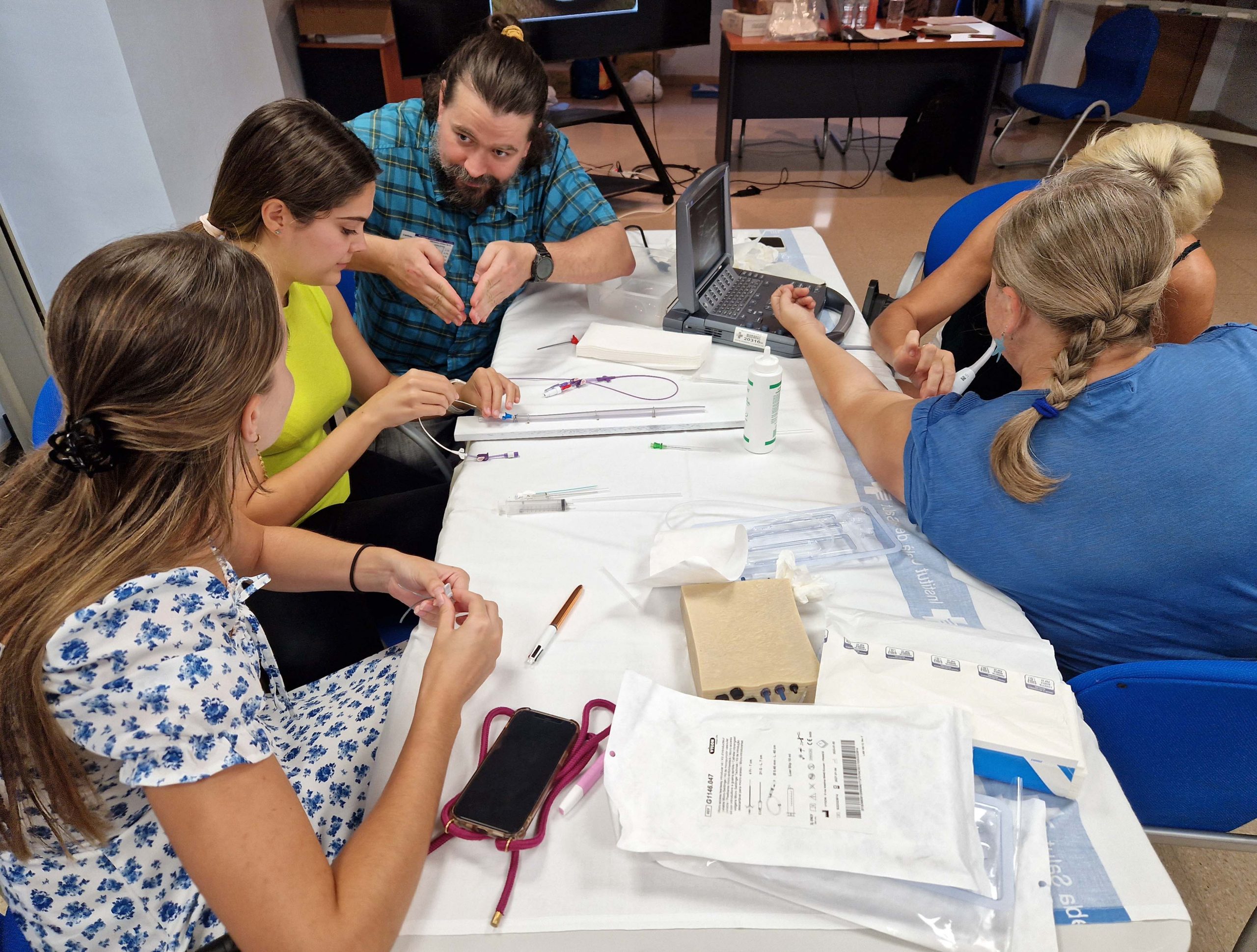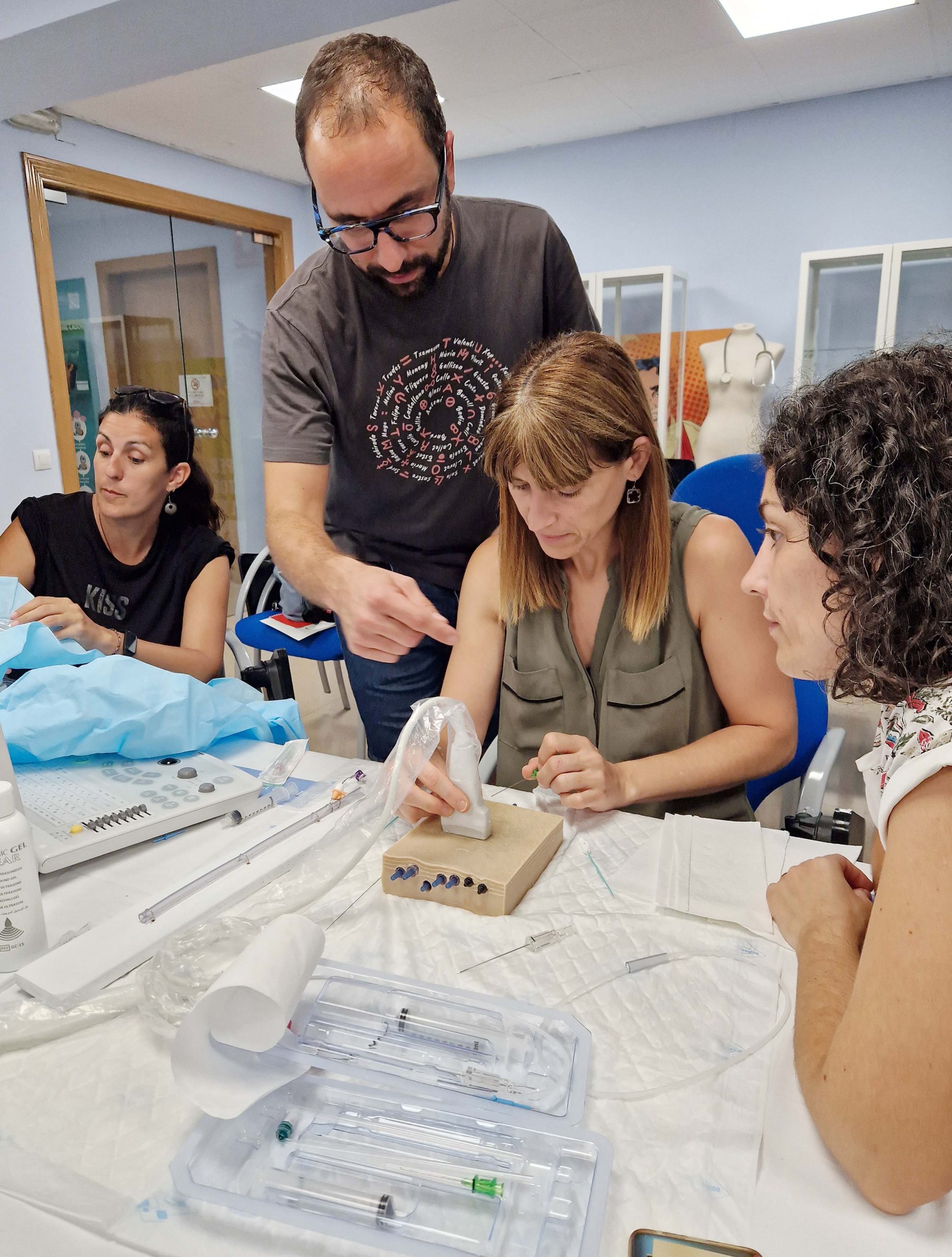 Ferran Padilla, Alejandro Bergua i Jordi Farrero –membres de la Unitat Funcional d’Accessos Vasculars de l’Hospital Universitari Arnau de Vilanova (HUAV) de Lleida– han impartit una nova edició del ‘Curs de punció ecoguiada i dispositius d’accés vascular’, a la seu del Col·legi Oficial d’Infermeres i Infermers de Lleida (COILL). Aquesta formació entorn del maneig dels DAV és una de les més demandades i va tenir lloc els dies 18, 20, 25 i 27 de setembre.