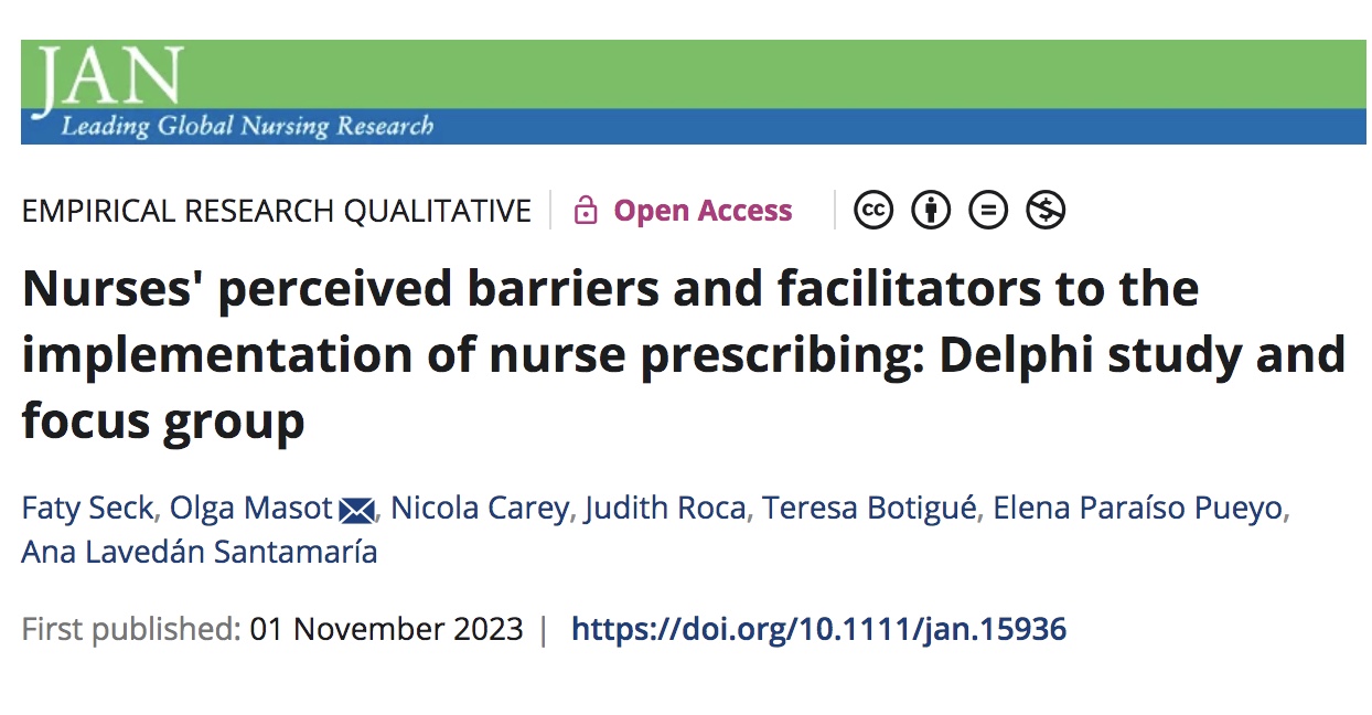 El novembre de 2023, el Journal of Advanced Nursing va publicar l’article “Nurses‘ perceived barriers and facilitators to the implementation of nurse prescribing: Delphi study and focus group” de Faty Seck, Olga Masot, Nicola Carey, Judith Roca, Teresa Botigué, Elena. Paraíso Pueyo i Ana Lavedán Santamaría.