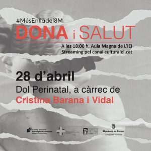 El dol perinatal i la seva visibilització, a càrrec de la llevadora Cristina Barana Vidal, ha estat la segona de les conferències del cicle “Dona i Salut #MésEnllàdel8m”; una iniciativa organitzada per les àrees d’Igualtat i Salut de la Diputació de Lleida, amb el suport de l’Institut d’Estudis Ilerdencs (IEI) i la col·laboració del Col·legi Oficial d’Infermeres i Infermers de Lleida i de la delegació territorial a Lleida del Col·legi de Psicologia de Catalunya.