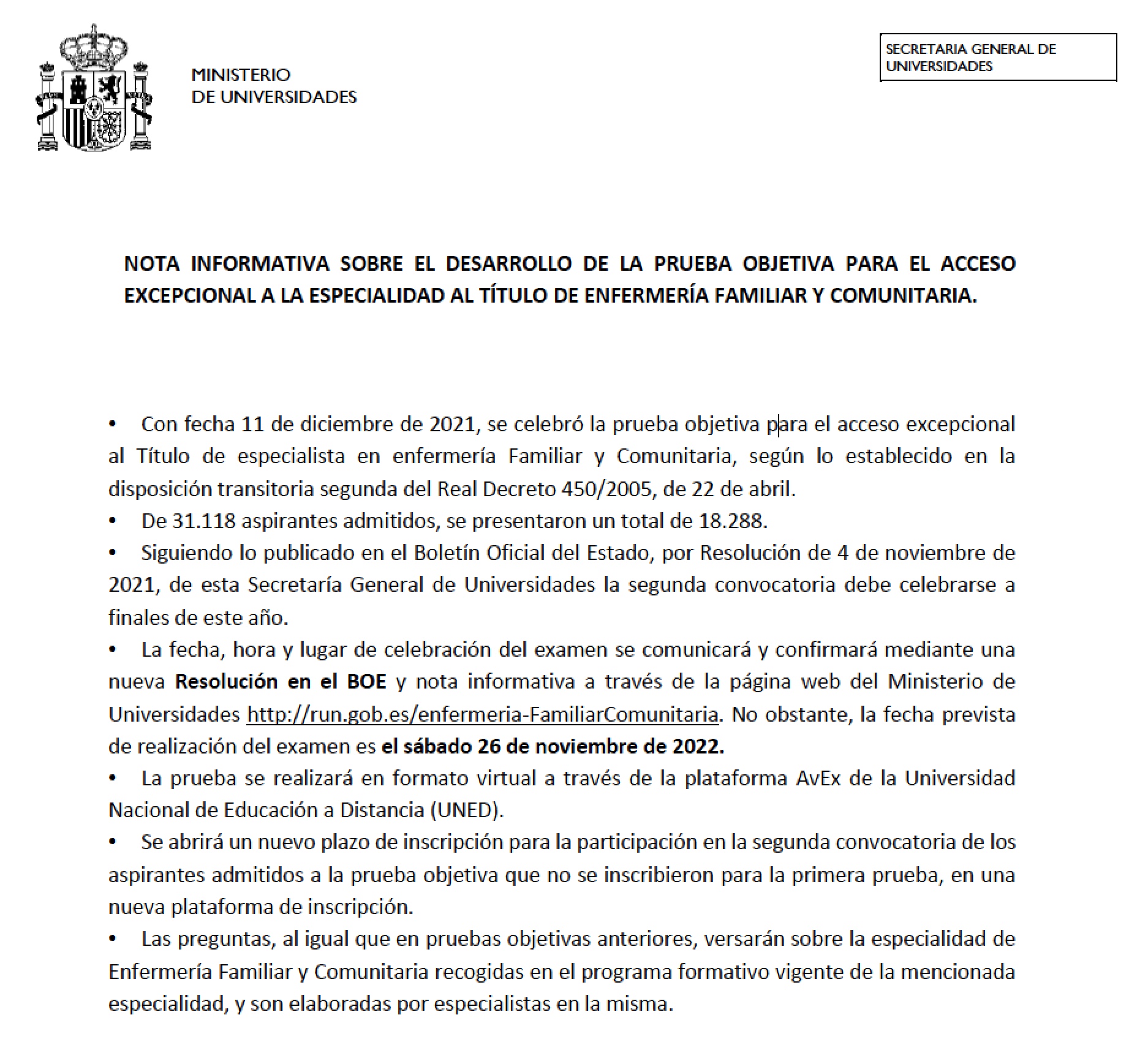 26/11/22 SEGUNDA PRUEBA FYC: NOTA INFORMATIVA SOBRE EL DESARROLLO DE LA PRUEBA OBJETIVA PARA EL ACCESO EXCEPCIONAL A LA ESPECIALIDAD AL TÍTULO DE ENFERMERÍA FAMILIAR Y COMUNITARIA. Ministerio de Universidades