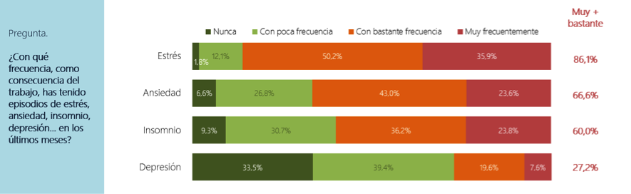 Les conseqüències emocionals i la salut mental de les infermeres és un dels punts clau que des del CGE demanen abordar després de presentar els resultats de l’enquesta. I és que gairebé 9 de cada 10 infermeres (88,3%) reconeix que la càrrega de treball els afecta psicològicament. El 86,1% de les infermeres han patit episodis d’estrès, el 66,6% d’ansietat, el 60% d’insomni i el 27,2% declaren haver arribat a patir depressió.