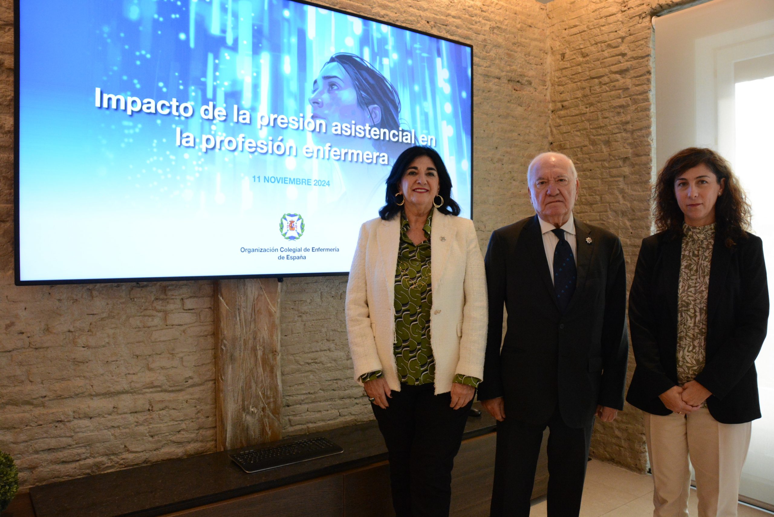 Peu de foto: Raquel Rodríguez Llanos, vicepresidenta del CGE; Florentino Pérez Raya, president del CGE; i Guadalupe Fontán, coordinadora de l’Instituto Español de Investigación Enfermera del CGE.
