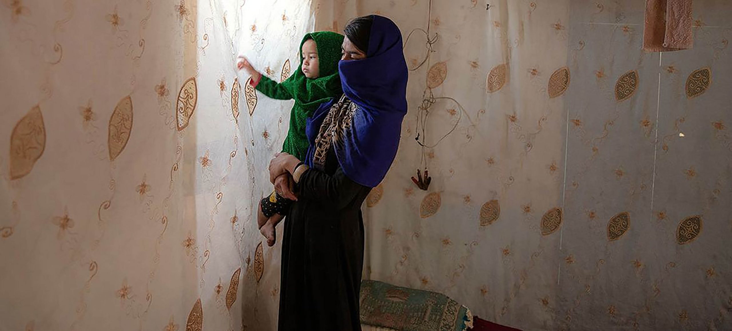 Una mare afganesa sosté la seva filla als braços, mirant la llum des de darrere de la finestra enfosquida.