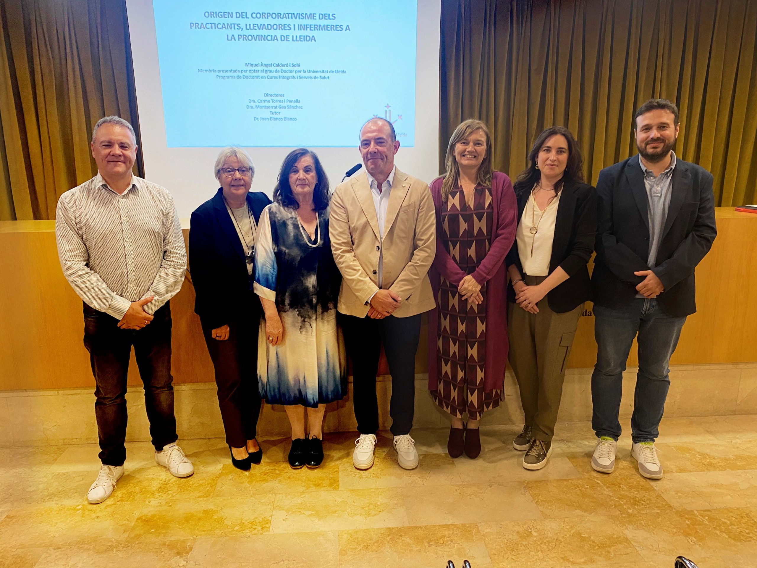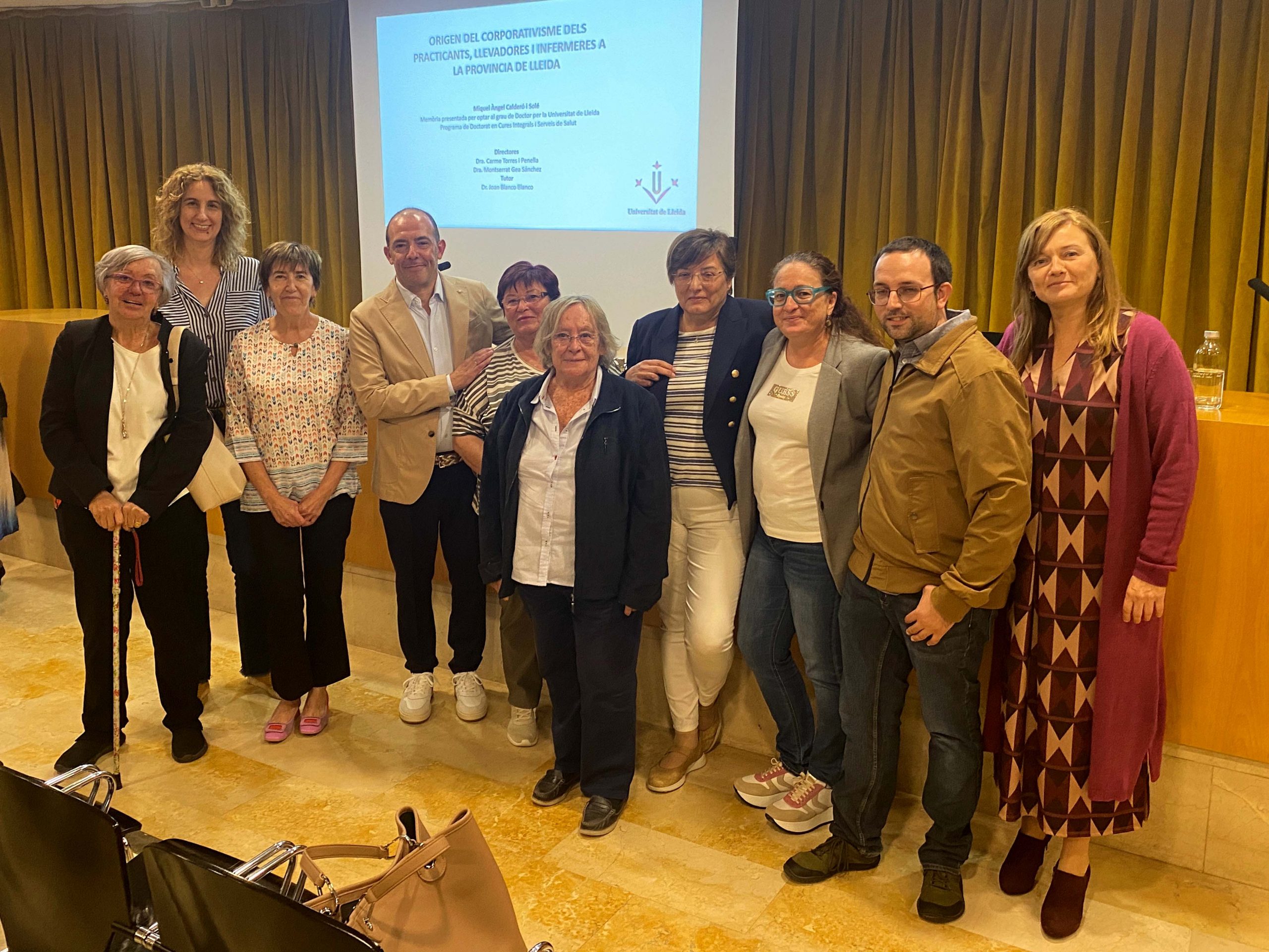 Moltes són les infermeres que han acompanyat Miquel Àngel Calderó en la lectura de la seva tesi “Origen del corporativisme dels practicants, llevadores i infermeres a la província de Lleida” que, en paraules de la presidenta del COILL, Mercè Porté, “és un exercici generós d’introspecció professional a través del temps, amb les seves llums i les seves ombres; però, sens dubte, amb un aprenentatge que ens ha d’enfortir com a col·lectiu i recordar-nos que no sempre vam estar tan ben organitzades, ni vam ser tan fortes com ho som avui. Cultivar l’afecte cap als nostres col·legis professionals i participar-hi, és la millor recepta per aconseguir aquest reconeixement professional i laboral que totes reivindiquem”.
