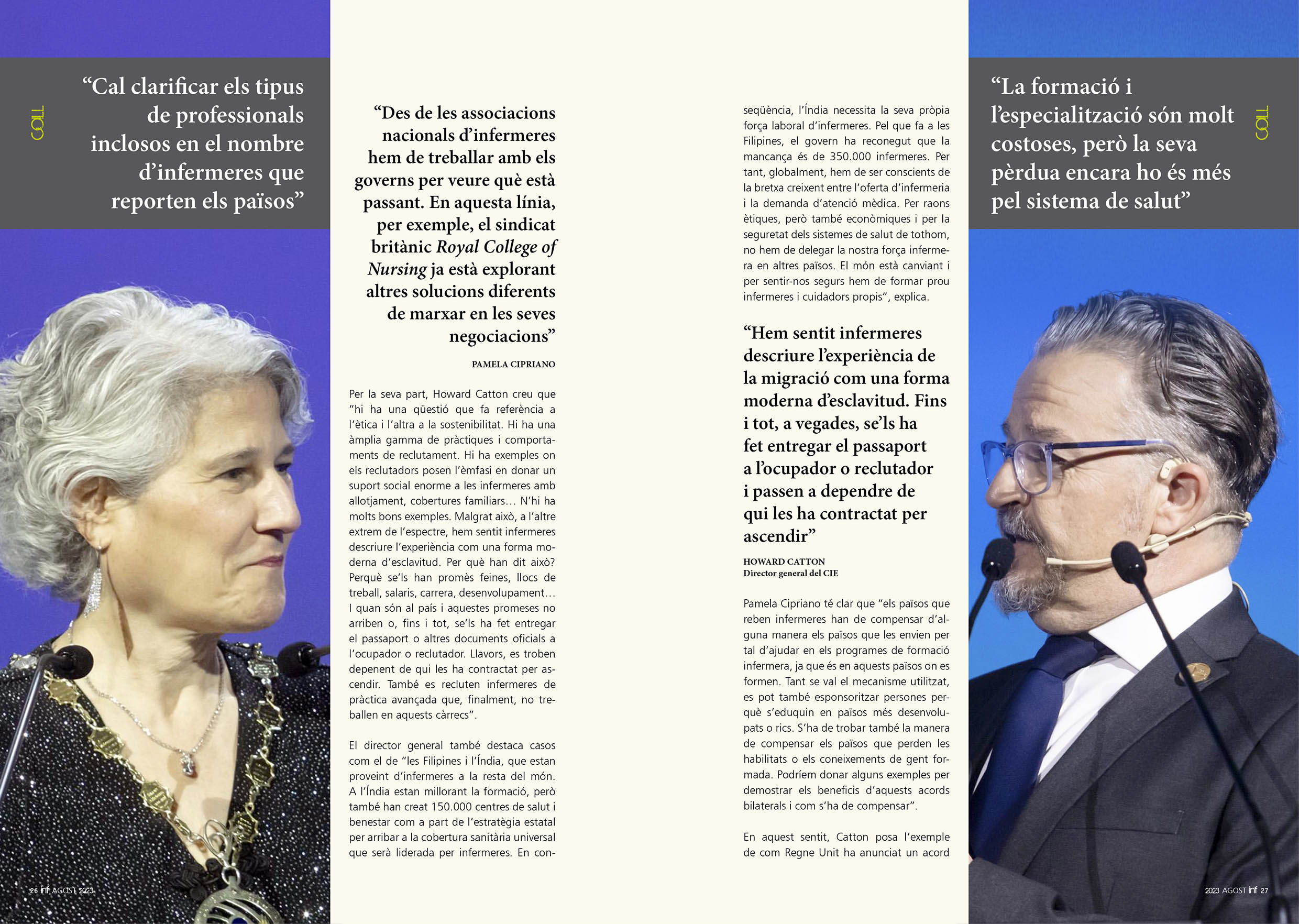 Pamela Cipriano té clar que “els països que reben infermeres han de compensar d’al- guna manera els països que les envien per tal d’ajudar en els programes de formació infermera, ja que és en aquests països on es formen. Tant se val el mecanisme utilitzat, es pot també esponsoritzar persones per- què s’eduquin en països més desenvolu- pats o rics. S’ha de trobar també la manera de compensar els països que perden les habilitats o els coneixements de gent formada. Podríem donar alguns exemples per demostrar els beneficis d’aquests acords bilaterals i com s’ha de compensar”.