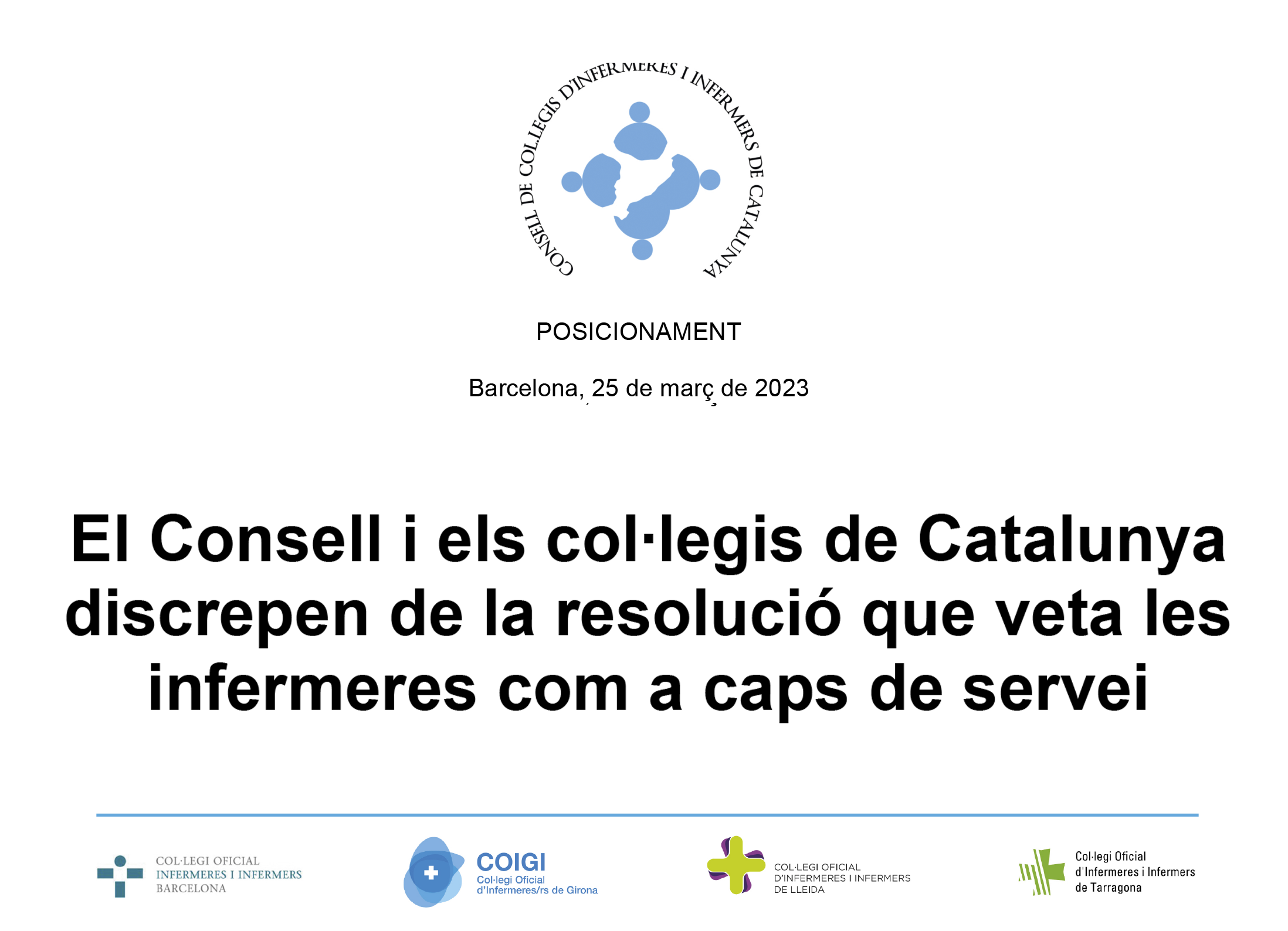 POSICIONAMENT I El COILL, el Consell i la resta de col·legis de Catalunya discrepen de la resolució que veta les infermeres com a caps de servei
