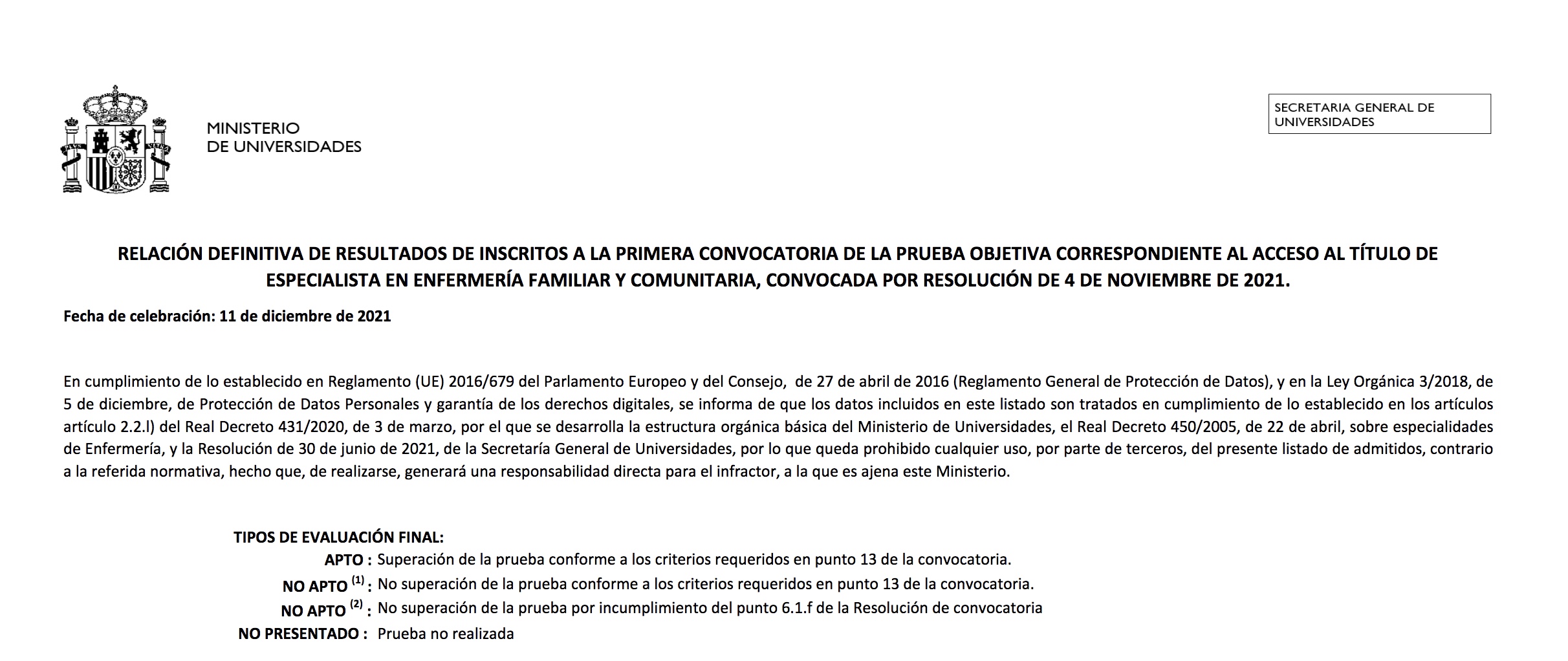 RELACIÓ DEFINITIVA DE RESULTATS D’INSCRITS A LA PRIMERA CONVOCATÒRIA DE LA PROVA OBJECTIVA CORRESPONENT A L’ACCÉS AL TÍTOL D’ESPECIALISTA EN INFERMERIA FAMILIAR I COMUNITÀRIA, CONVOCADA PER RESOLUCIÓ DE 4 DE NOVEMBRE DE 2021.