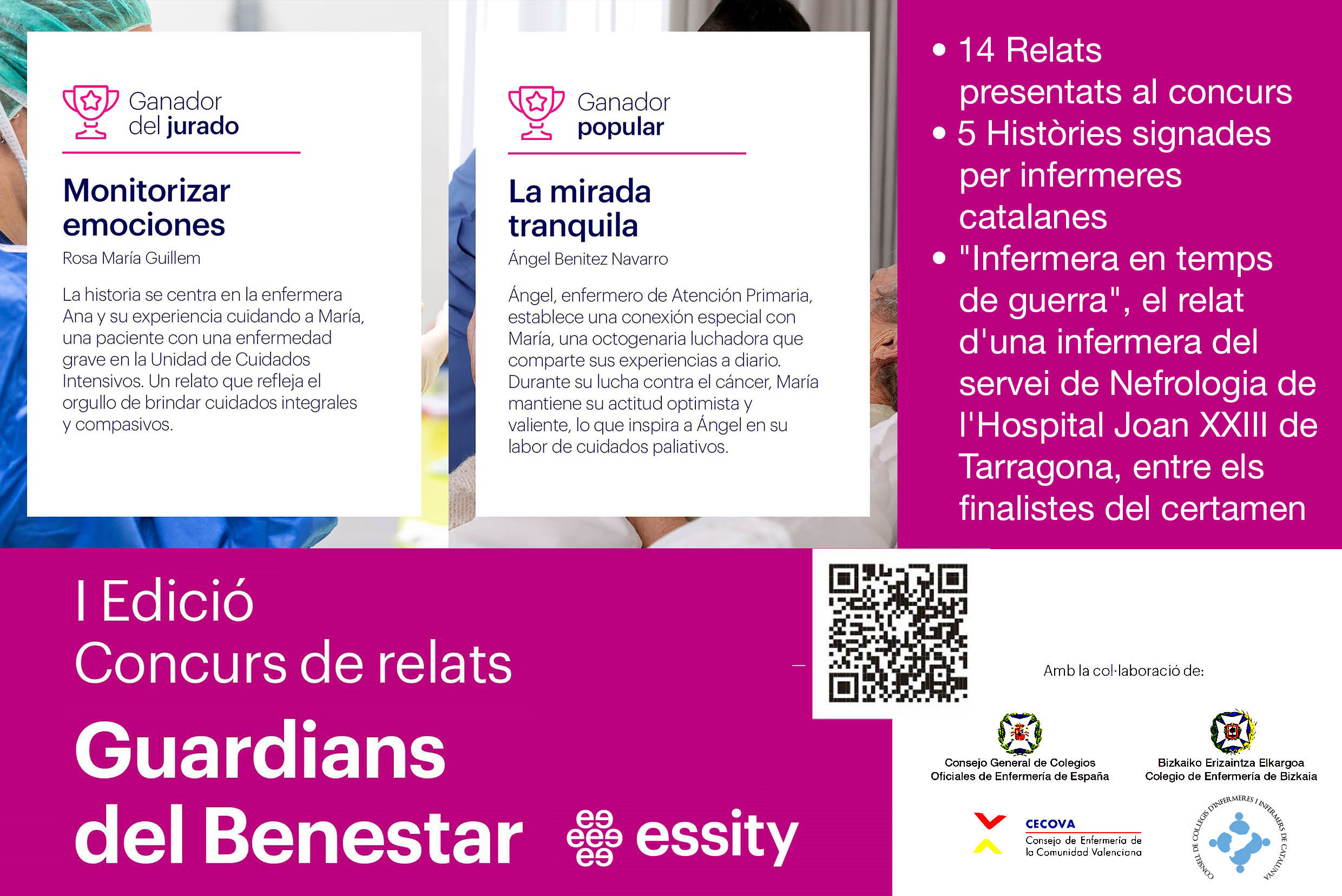 La primera edició del concurs de relats per a infermeres “Guardianes del Benestar” ja té guanyadors. La infermera de l’UCI de l’Hospital de València, Rosa María Jorge Guillem, s’ha alçat amb el Premi del Jurat amb la composició “Monitorar emocions” que destaca l’orgull de brindar una atenció integral i humanitzar les cures; mentre que l’infermer d’Atenció Primària de Múrcia, Ángel Benítez ha estat el guanyador de la Votació Popular amb el seu relat “La mirada tranquil·la”, centrat en la connexió del protagonista amb Maria, una octogenària indestructible amb qui comparteix converses i aprenentatges mentre l’atén en cures pal·liatives Ambdós guardonats rebran un premi de 650 euros en ajuts a la formació.