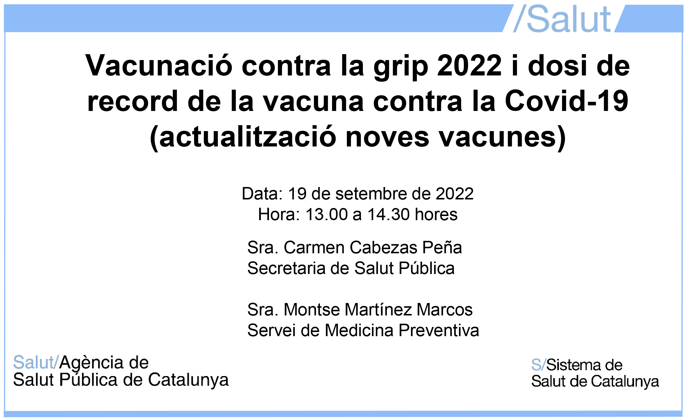 El Departament de Salut ha organitzat un nou seminari web sobre “Vacunació contra la grip 2022 i la dosi de record de la vacuna contra la covid-19”, per al pròxim dilluns 19 de setembre, entre les 13 i les 14.30 hores.